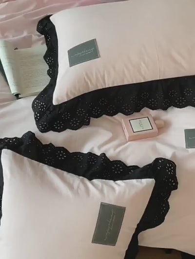 Transform your bedroom with the rich elegance of our Black Lace Ruffle Bedding Set from Ever Lasting. This set embodies classic romance with intricate black lace details that exude sophistication and coquette charm. Crafted for both aesthetics and comfort, it creates a haven of timeless beauty and relaxation. Each duvet cover features four corner ties and a hidden zipper, ensuring your duvet insert stays securely in place all night. Elevate your sleep experience with this exquisite bedding set, where the allure of lace meets the promise of serene sophistication in every ruffle. Perfect for adding a touch of purple elegance to your decor.