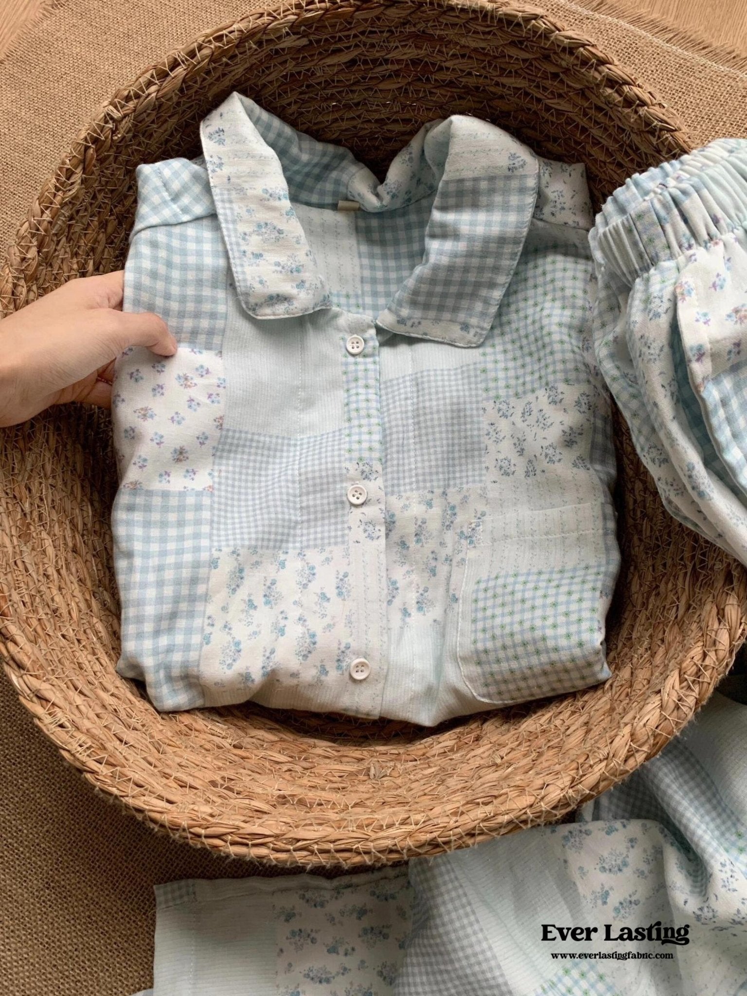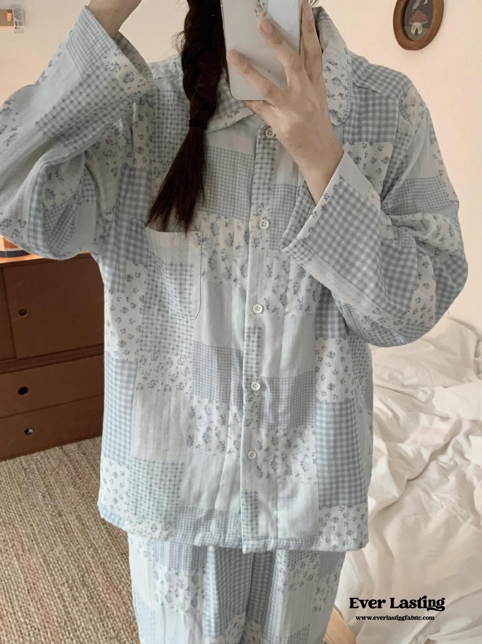 Indulge in comfort and charm with Ever Lasting’s Sweet Cottagecore Blue Floral Long Sleeves and Pants Pajama Set. Crafted from 100% soft, breathable cotton, this set is designed to keep you cozy while allowing your skin to breathe throughout the night. The delicate blue floral pattern exudes a cute, cottagecore-inspired aesthetic, making it a perfect addition to your loungewear collection. The long-sleeved top features a relaxed fit with a classic button-down front for effortless wear, while the matching full-length pants include an adjustable elastic waistband for customizable comfort.
