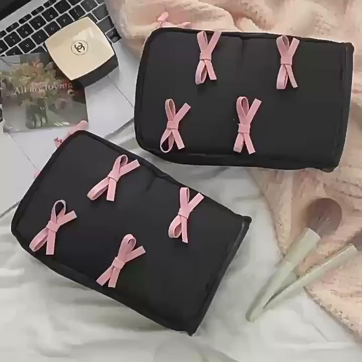 Keep your beauty must-haves stylishly organized with this Cute Bow Black Makeup Bag from Ever Lasting. Designed with a sleek silhouette and a charming bow detail, it's the perfect blend of elegance and everyday function. Whether you're traveling or freshening up at home, this bag keeps your bathroom essentials tidy and close at hand.