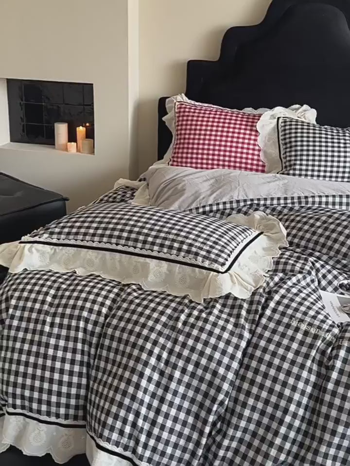 Refresh your space with Ever Lasting’s Hazel Vintage Gingham Ruffle Bedding Set, a perfect blend of coquette style and vintage charm. Crafted from airy, washed cotton for all-season comfort, it features a classic black-and-white gingham print with romantic lace ruffle accents. Designed for soft girl or cottagecore lovers, this set brings gentle texture and warmth to your room. The duvet cover is finished with corner ties and a concealed zipper for a secure fit and lasting quality, making it as practical as it is pretty.