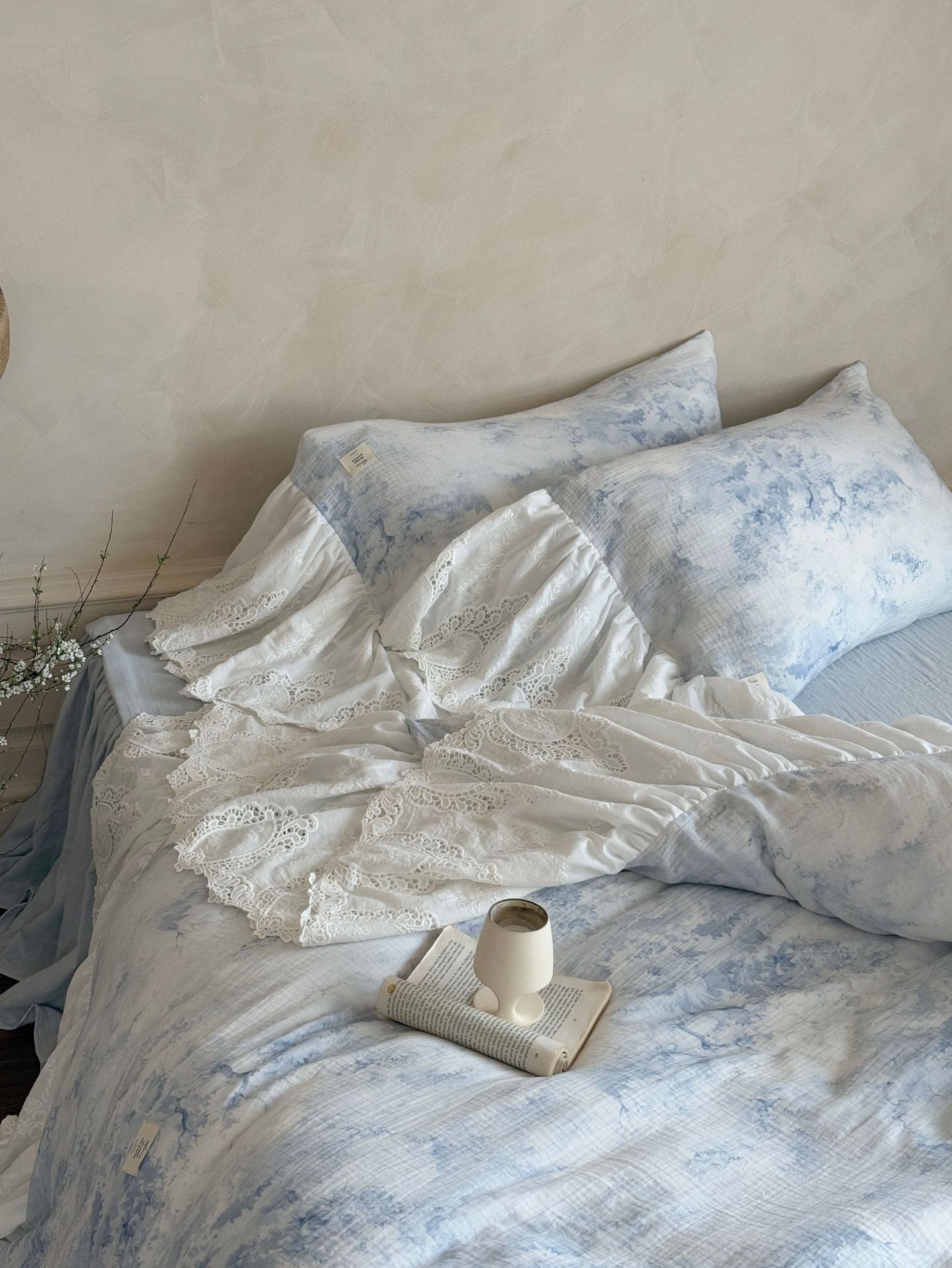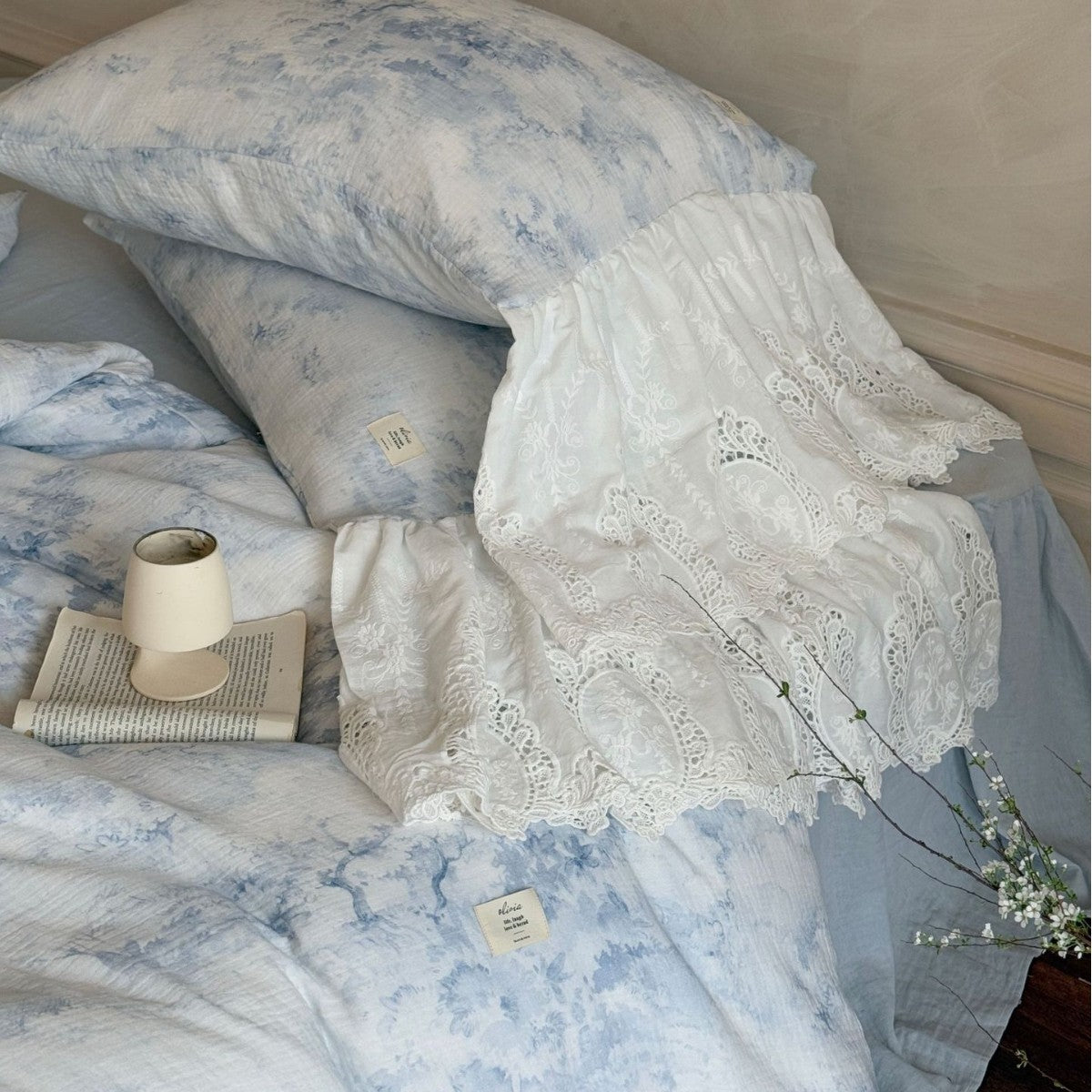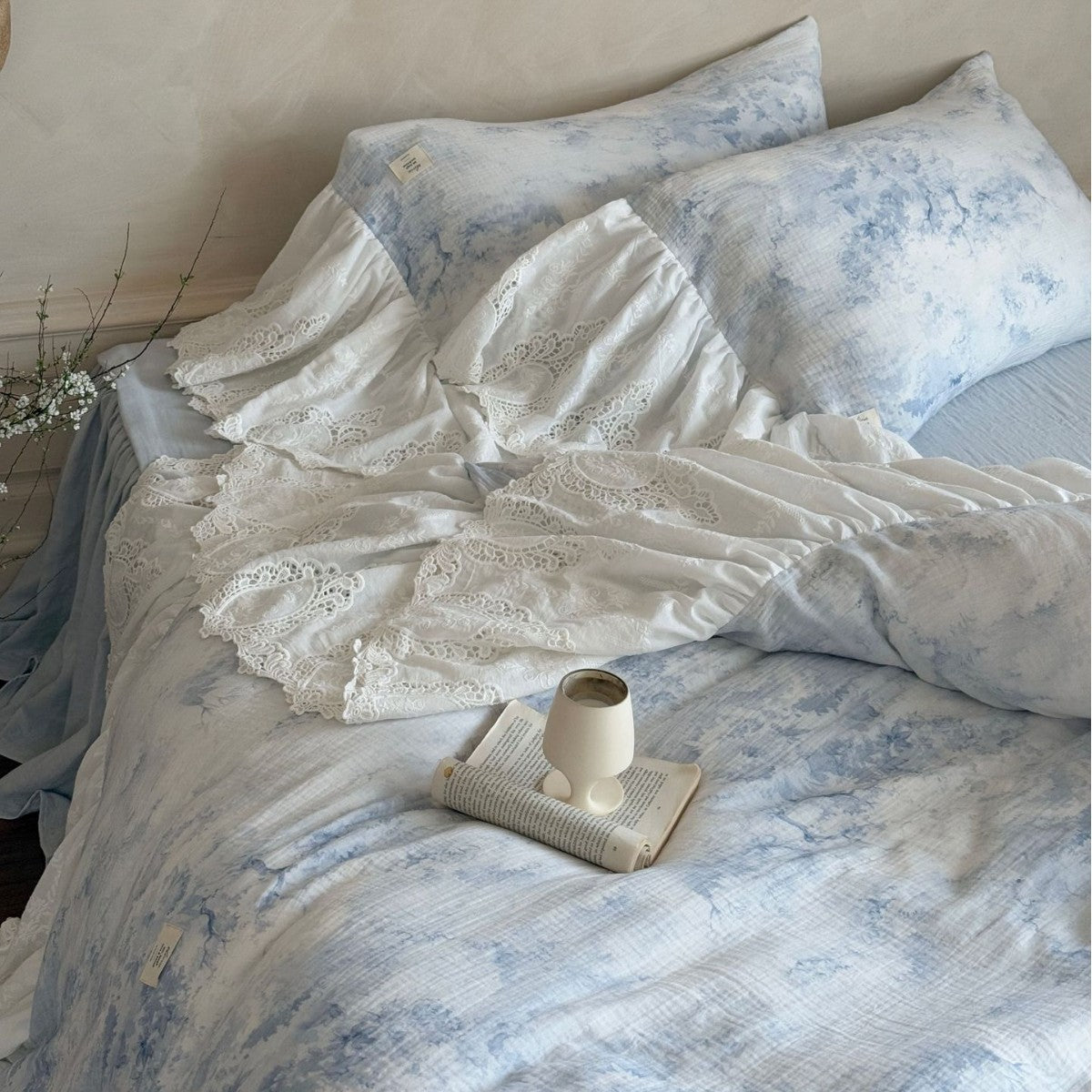 Drift into a soft daydream with the Sylvie Lace Gauze Bedding Set from Ever Lasting. Inspired by clear blue skies and the delicate quiet of a French countryside morning, this romantic set features breathable double-layer cotton gauze and cascading lace trim — complete with a flowing bedskirt-style hem.