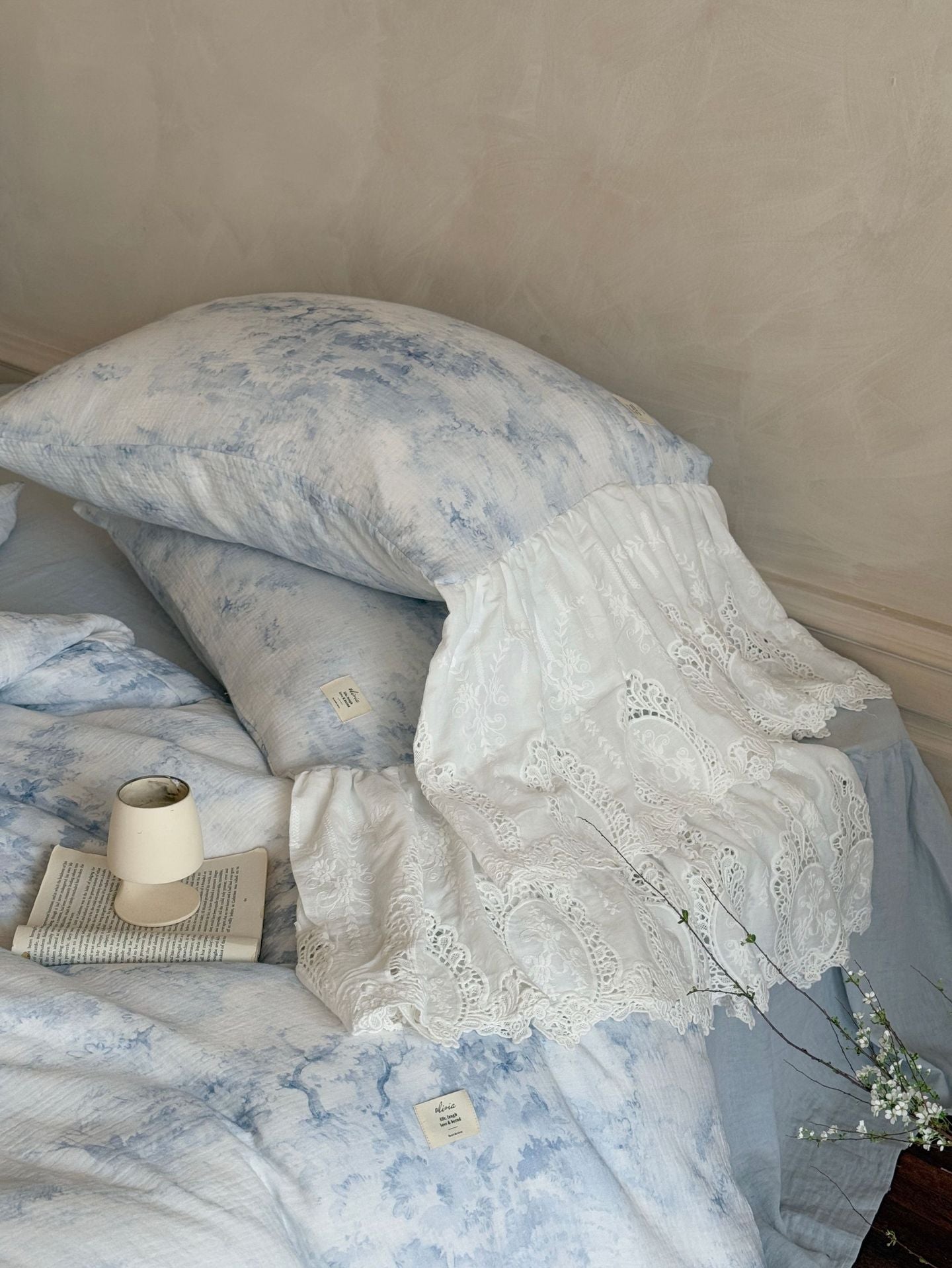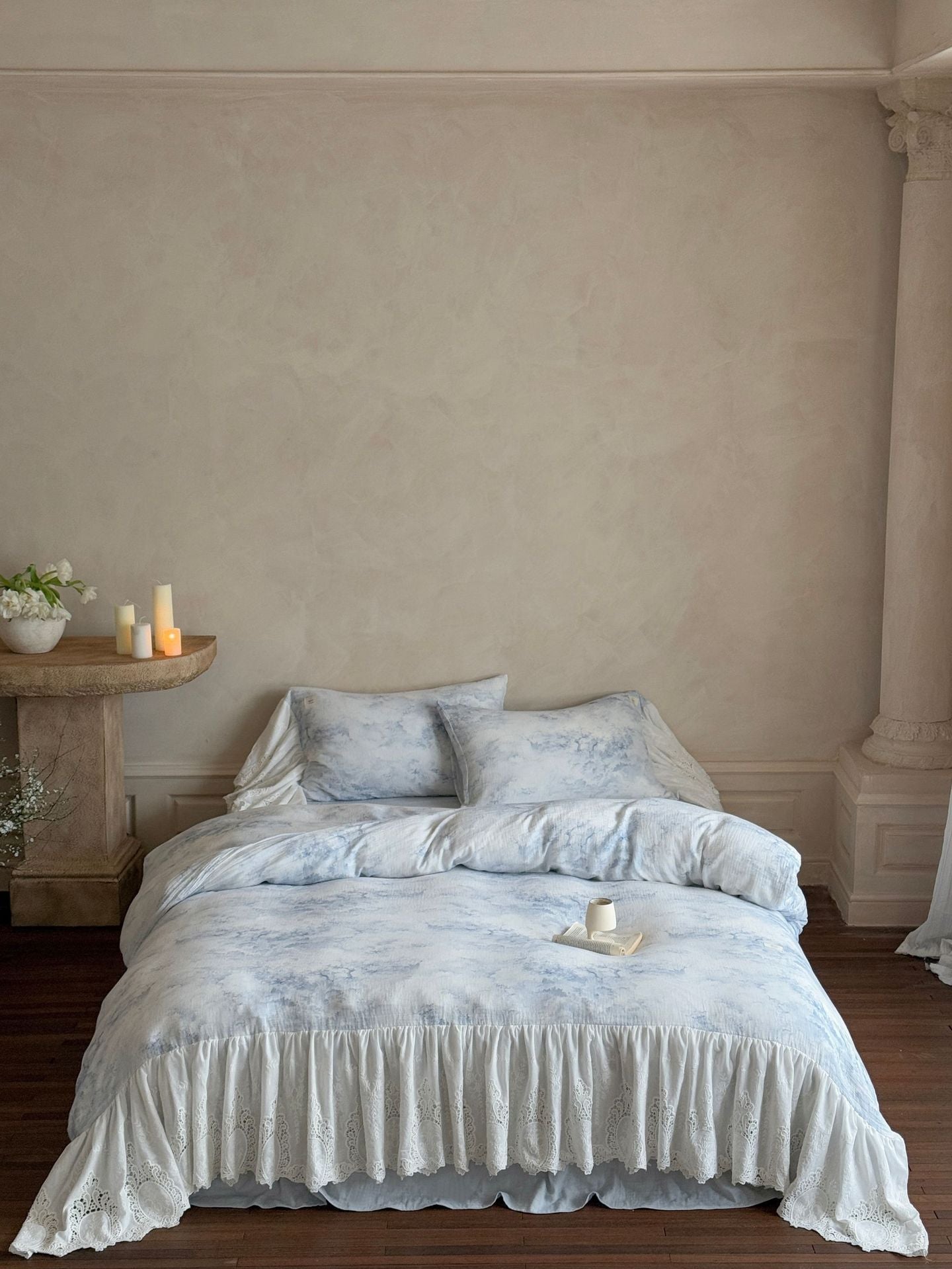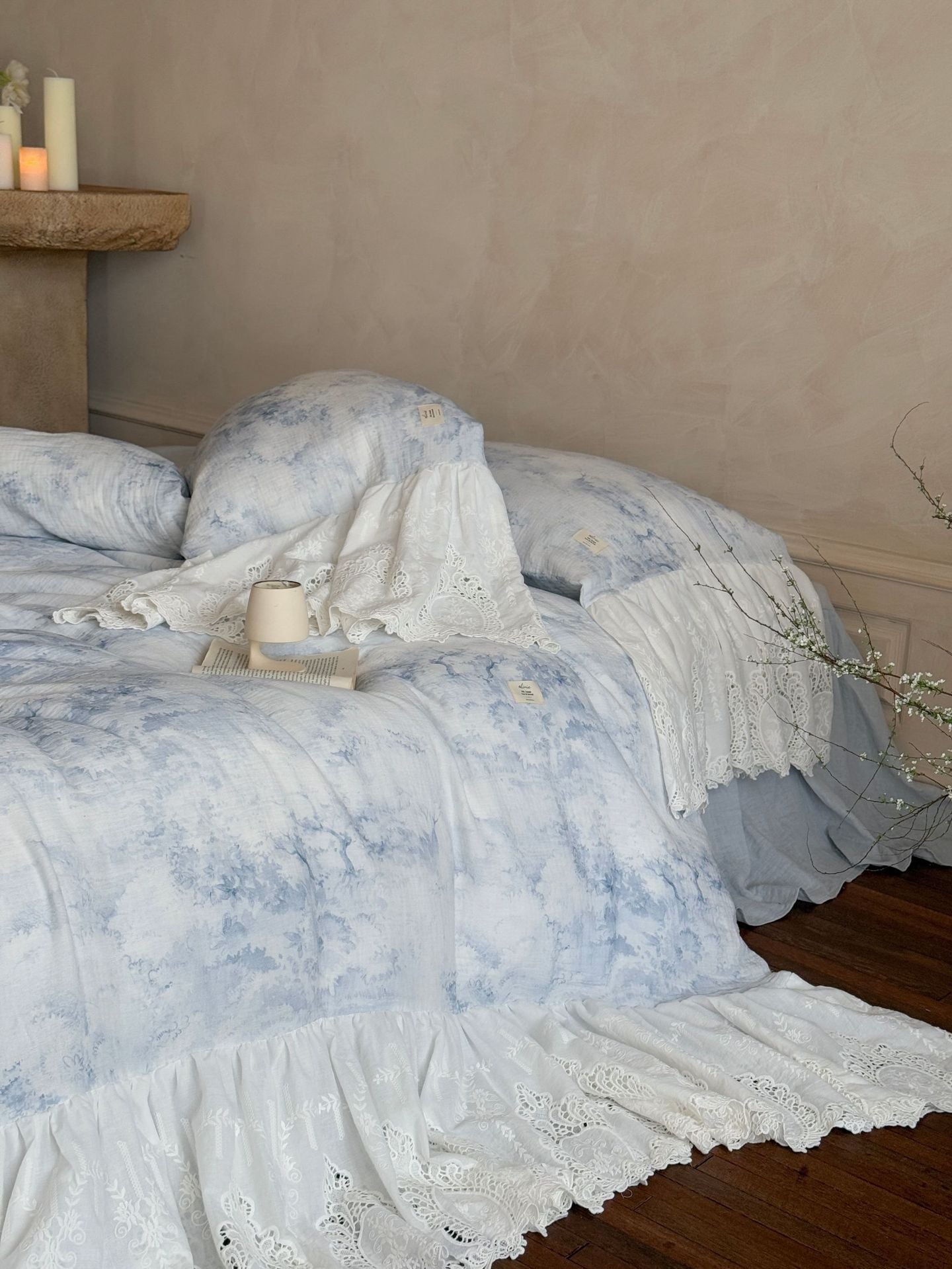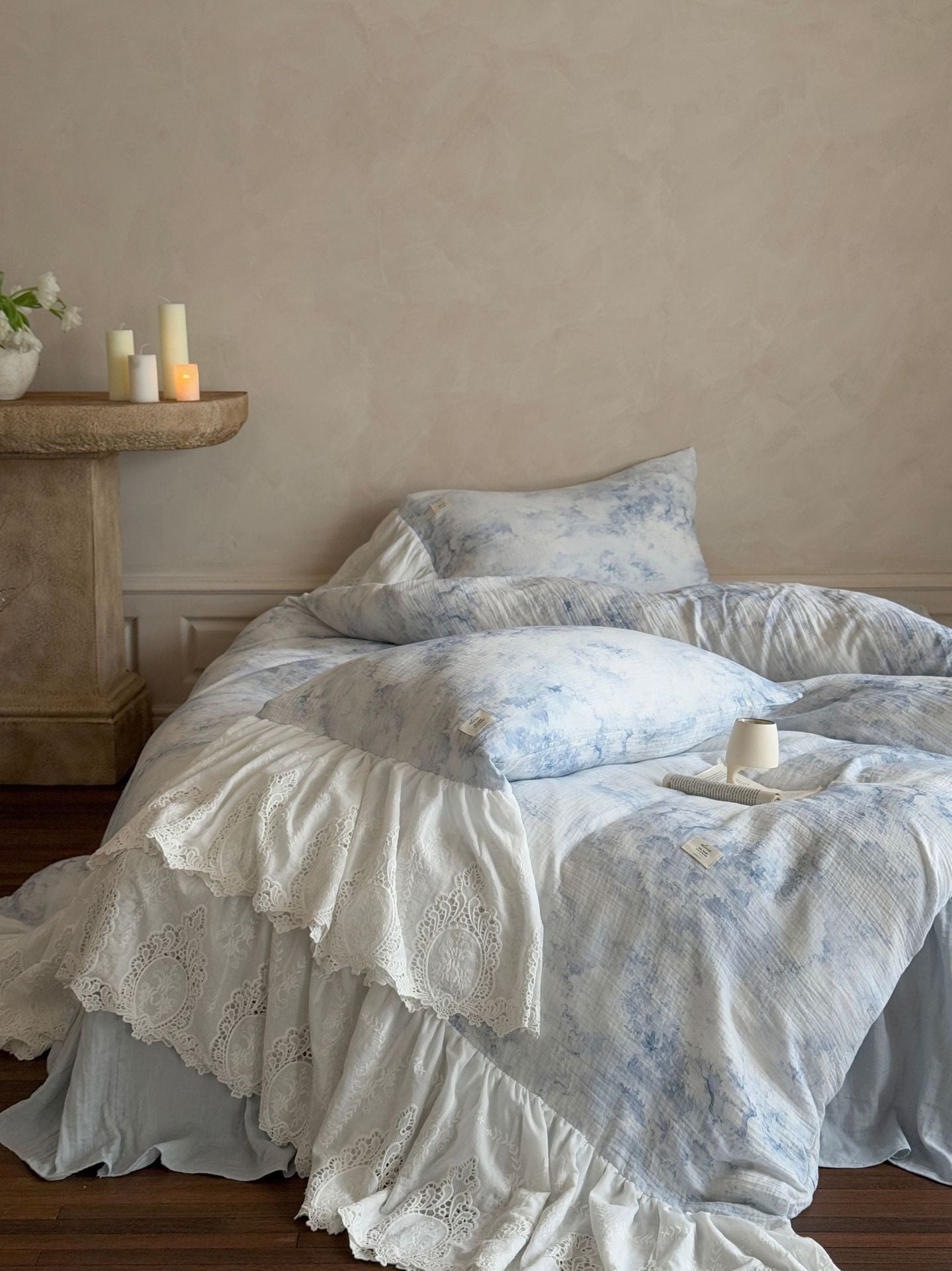 Drift into a soft daydream with the Sylvie Lace Gauze Bedding Set from Ever Lasting. Inspired by clear blue skies and the delicate quiet of a French countryside morning, this romantic set features breathable double-layer cotton gauze and cascading lace trim — complete with a flowing bedskirt-style hem.