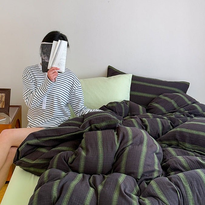 Vintage Striped Washed Cotton Bedding Set / Black & Green